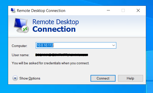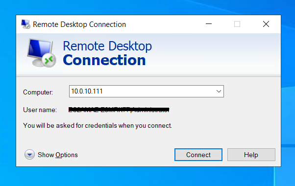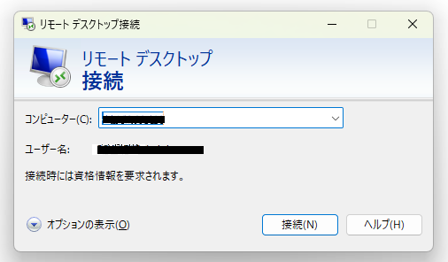 次に、自端末から リモートデスクトップ接続(RDP) を開き、管理サーバの ENI に関連付けた Elastic IP(EIP) を入力して接続します。