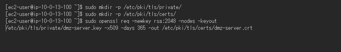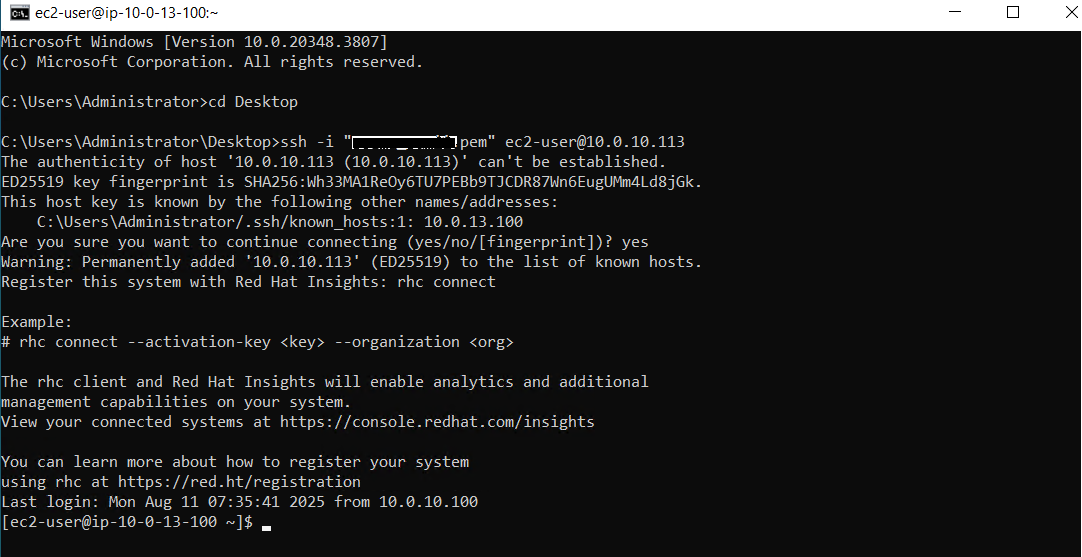 前提条件として、管理サーバから接続するために、ローカルにダウンロードしたキーペアファイル を管理サーバ上にコピー&ペーストして準備しておきます。準備ができたら、コマンドプロンプト を開き、キーペアファイルを保存したディレクトリに移動します。その後、以下のように SSH コマンド を使用して、キーペアファイルを指定しログインします。
