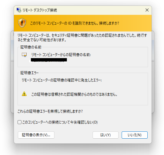 接続時に証明書エラーが表示されますが、そのまま無視して 「はい(Y)」 をクリックすれば接続が完了します。