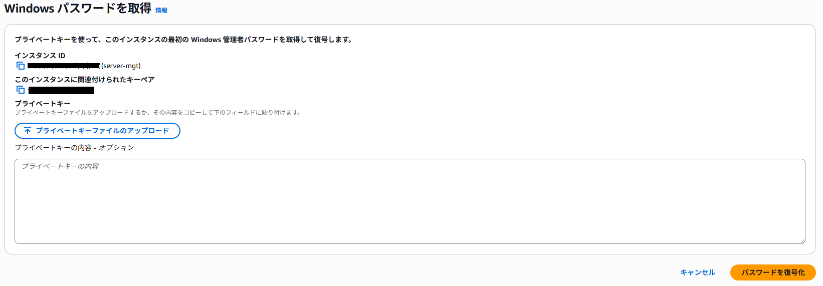 ローカルにダウンロードしてある キーペアファイル を指定し、パスワードを復号化します。復号化したパスワードは、後ほどログインに使用するため 控えておきましょう。