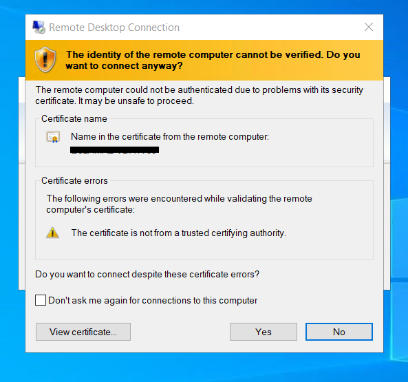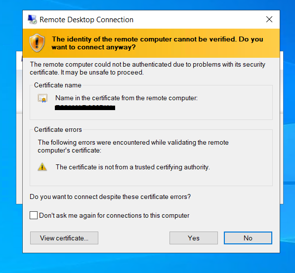 接続時に証明書エラーが表示されますが、そのまま無視して 「Yes」 をクリックすれば接続が完了します。