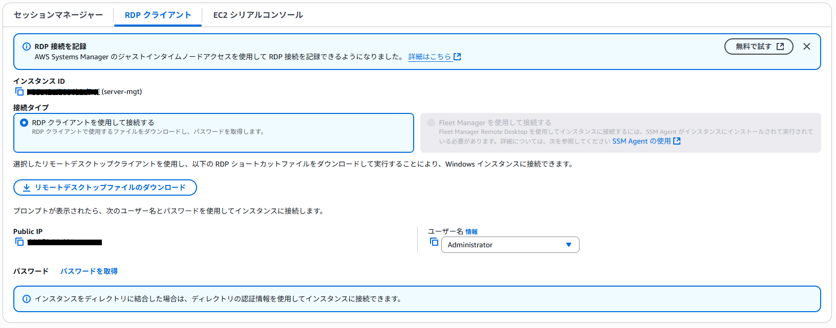 続いて、RDP クライアント を選択し、「パスワードを取得」 をクリックします。