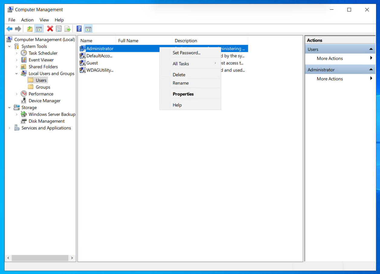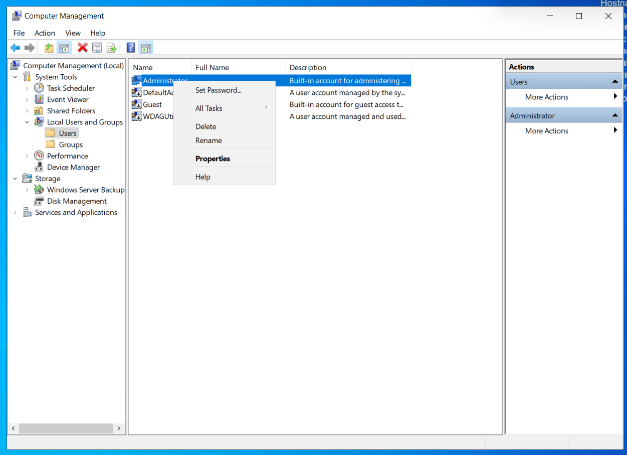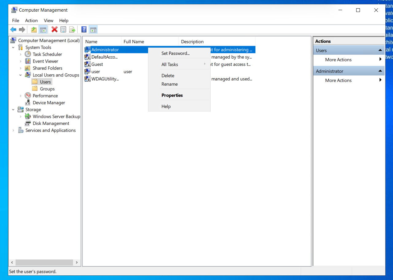 Windows サーバの検索メニューから 「Computer Management」 と入力して検索します。続いて、「Local Users and Groups」 → 「Users」 をクリックし、Administrator を右クリックします。メニューから 「Set Password」 を選択し、パスワードを変更します。