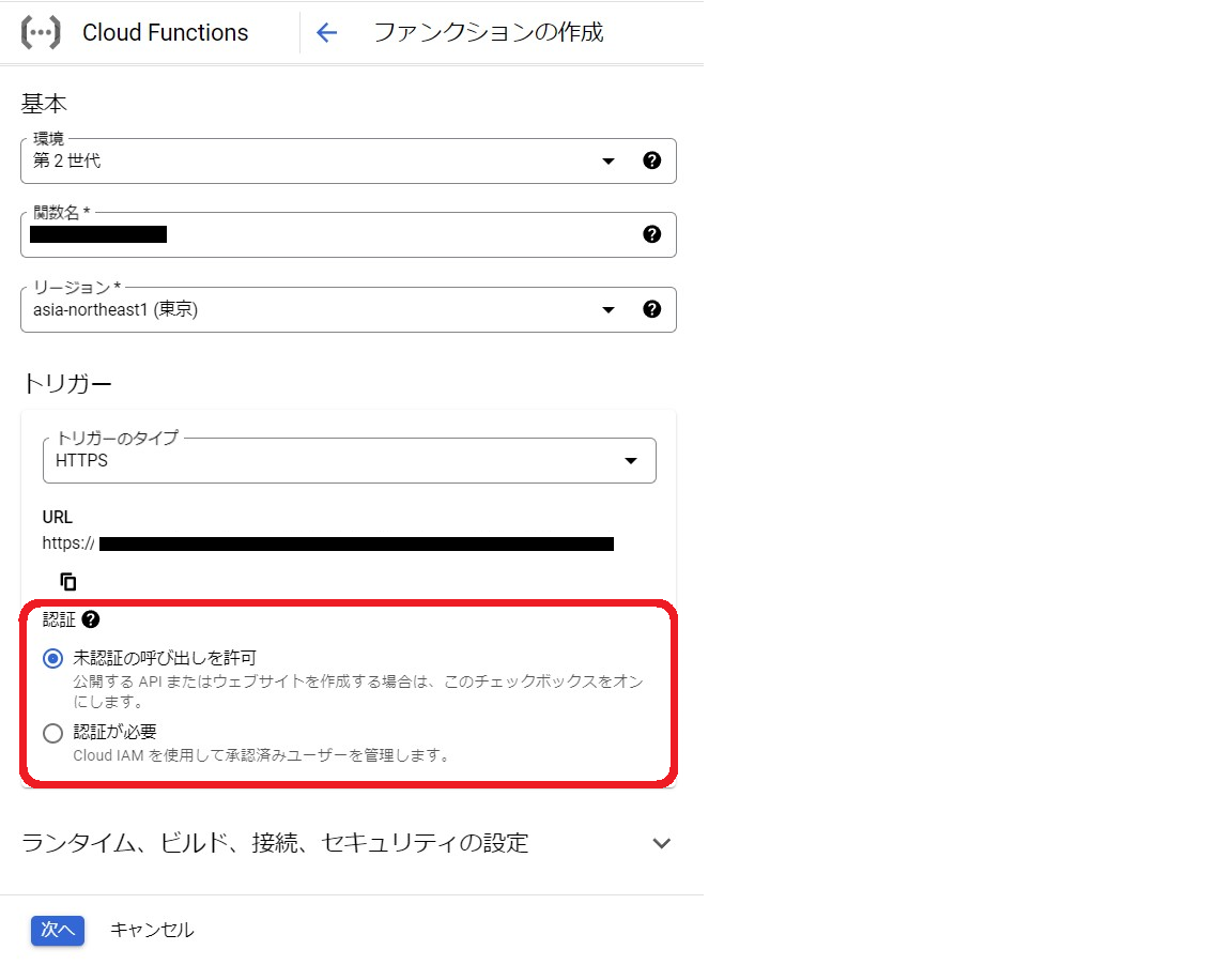 この際に、外部からHTTP関数を実行されないようにするために、ネットワークの上り(内向き)設定を「内部トラフィックのみを許可する」にします。これによりGoogle Cloudの内部ネットワークからのトラフィックのみが関数にアクセスできるようになります。つまり、外部からの直接的なアクセスは拒否されます。