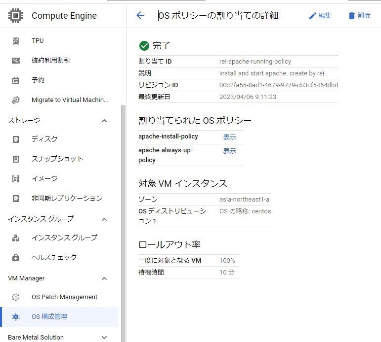 | ③ | OS Configuration Management | OSの状態を監視し、設定したポリシーに違反していたら、OS Configエージェントがポリシーに従った内容に状態を修正してくれるサービス。 60分ごとにポリシーをOS Configサービス(VM Manager)からOS Configエージェントに転送して、エージェントがポリシーを適用するか否かを判断しているそうです。 |