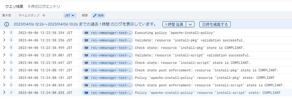 Apr 6 04:24:00 rei-vmmanager-test-01 OSConfigAgent[827]: 2023-04-06T04:24:00.8353Z OSConfigAgent Info: Check state post enforcement: resource "install-script" state is COMPLIANT.
