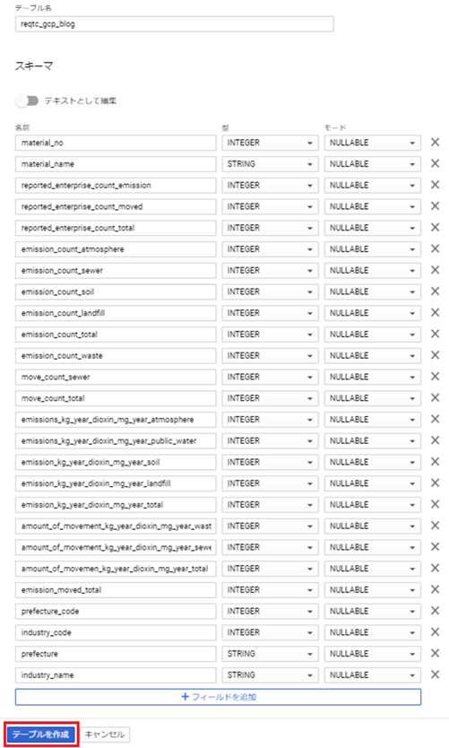 自動生成されたカラム名とデータ型が問題ないか確認して、テーブルを作成します。