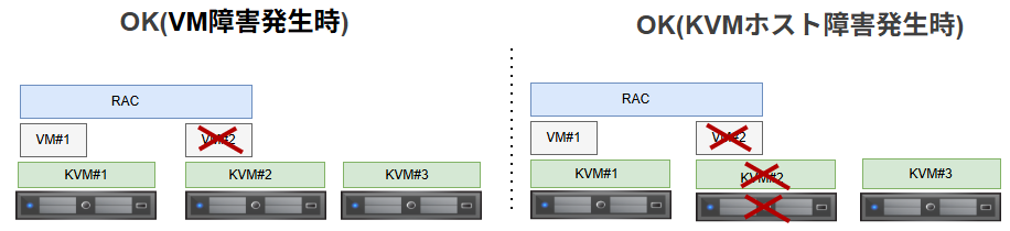 下図のようにVM#1,VM#2が同一KVMホストで稼働している配置ではKVMホストレベルの可用性を満たしていません。