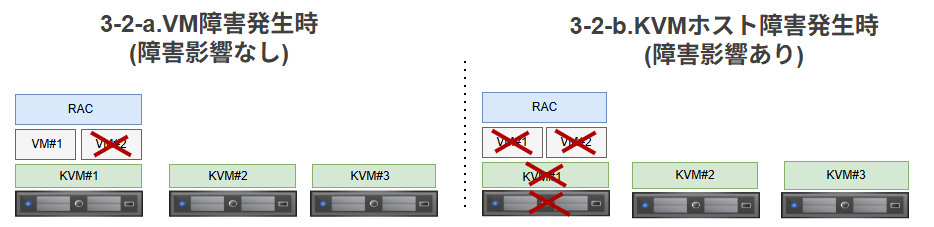 下図のような障害発生を想定すると、VMレベルの可用性は満たしているが、KVMホストレベルの可用性を満たしていないことが分かります。