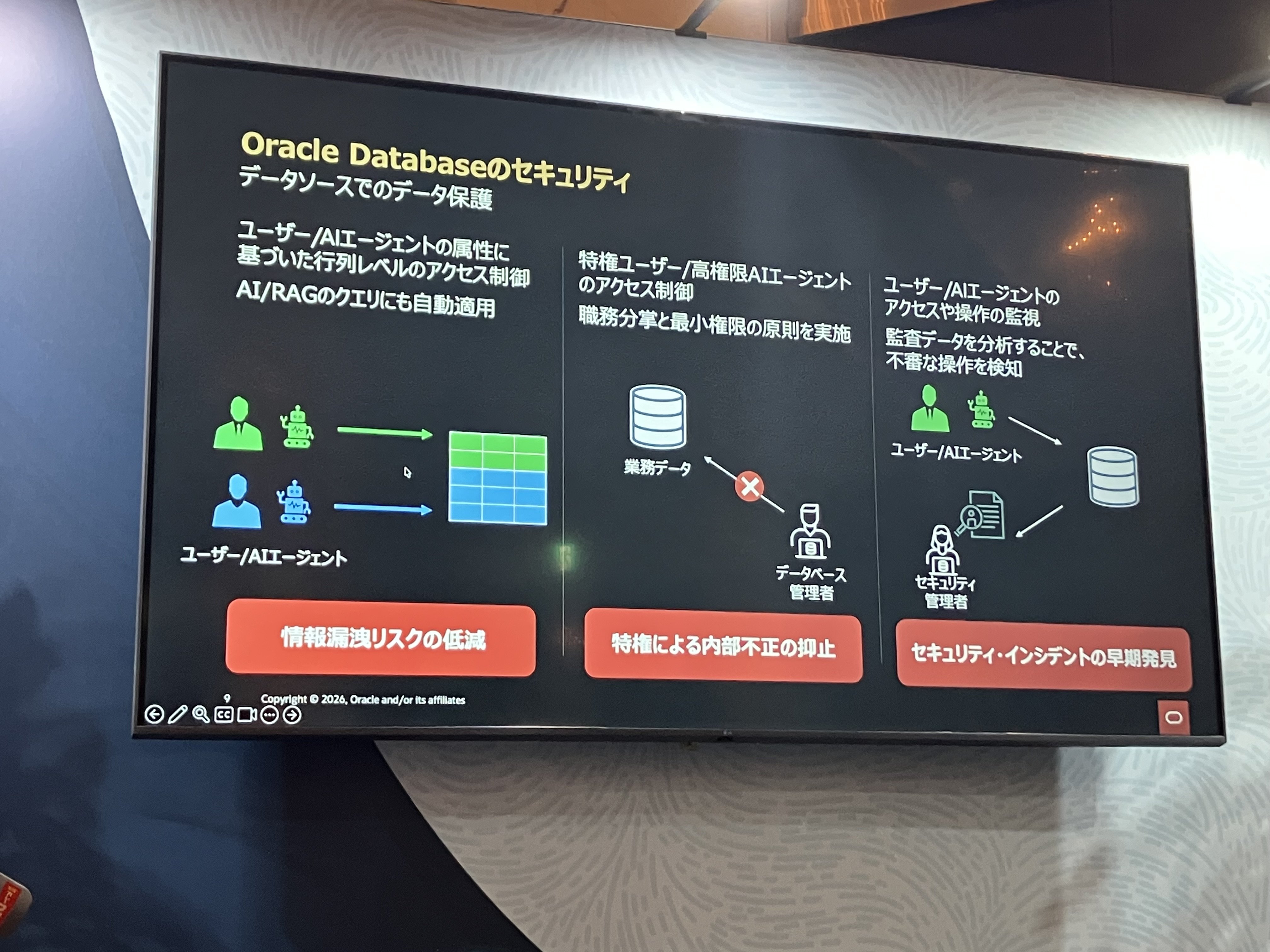 本セッションでは、Oracle Database 26aiが提供するAIエージェントや権限の強いユーザの、不正・誤アクセスの対策について紹介されました。