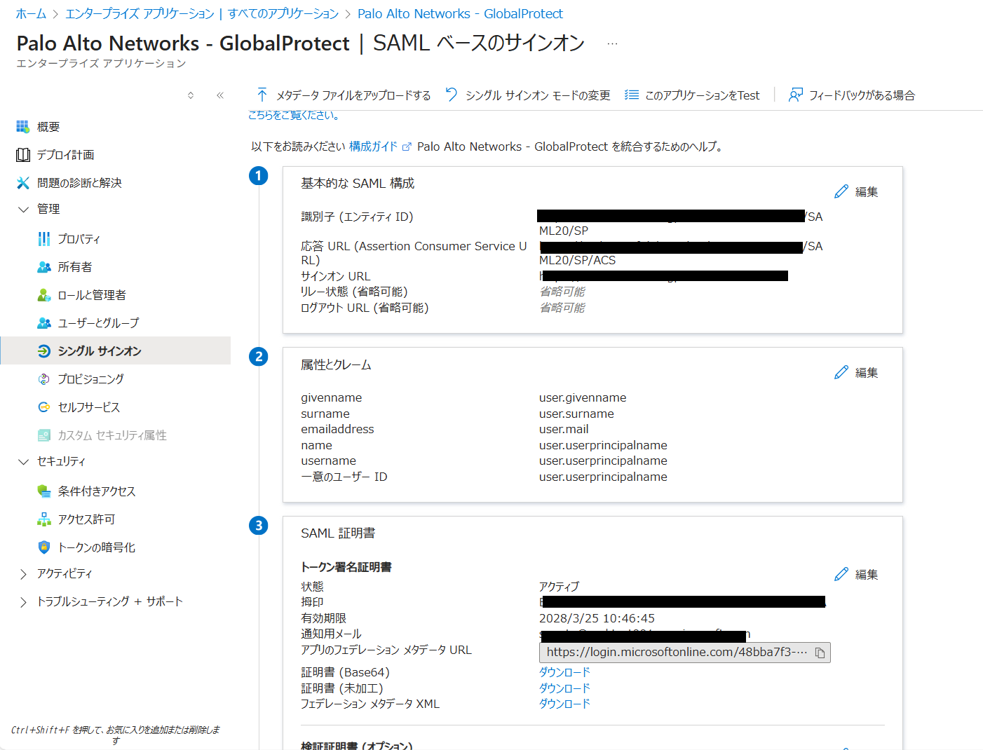 「SAML 証明書」 セクションにある 「フェデレーション メタデータ XML」 をダウンロードし、ローカルに保存します(後ほどPrisma Access側で使用します)。